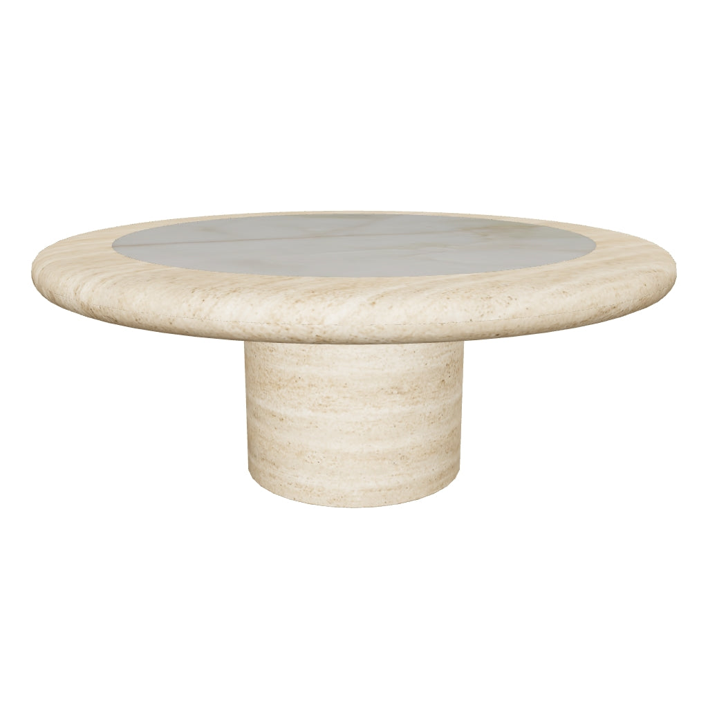 The Luna Ground Coffee Table is a low, sculptural piece formed from honed travertine and centred with a smooth onyx stone inlay. Its circular top and solid cylindrical base create a calm, architectural silhouette designed to anchor a space.