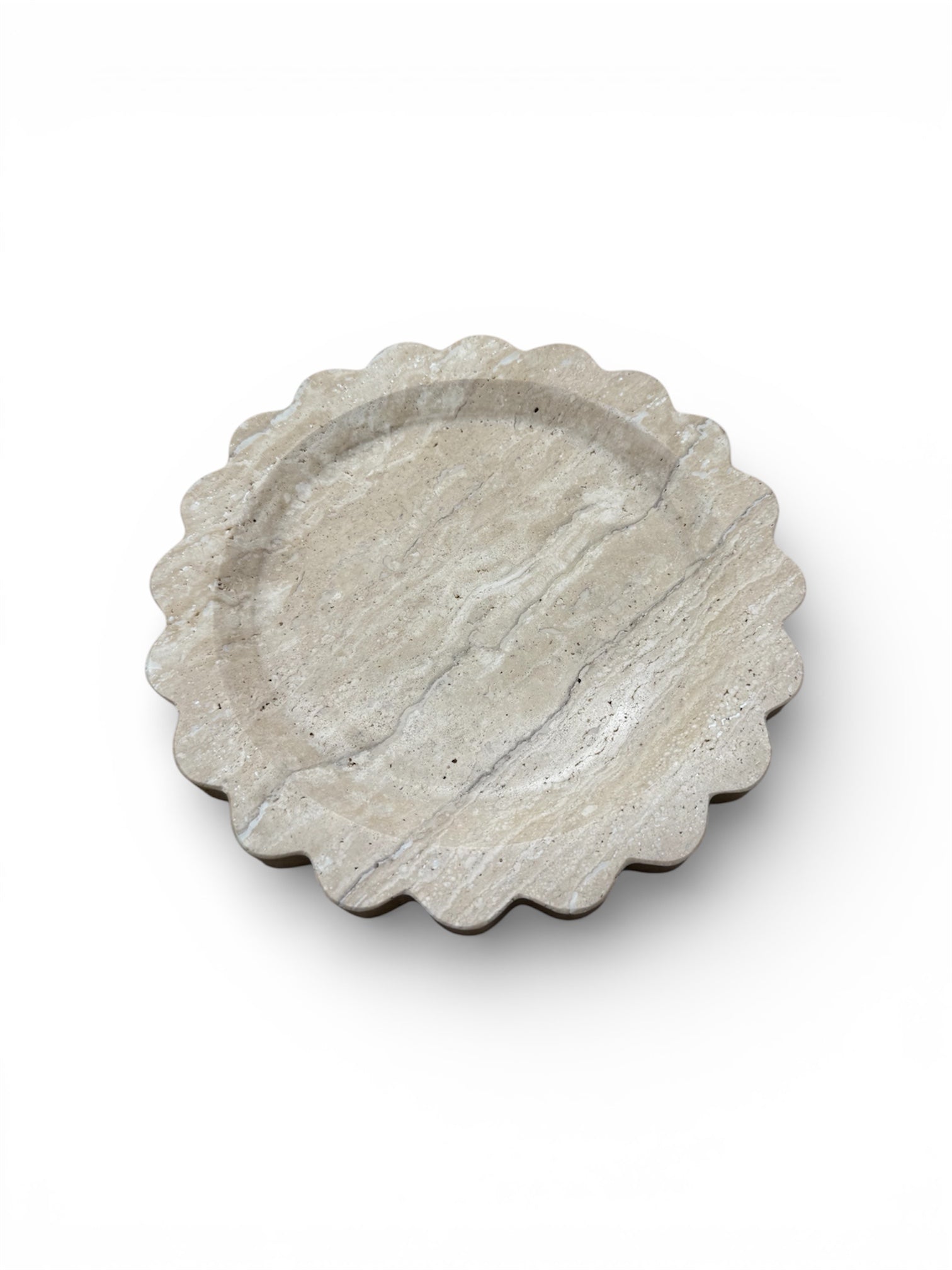 Carved from natural travertine, the Luna Scalloped Tray is a sculptural accent piece, designed to bring softness and quiet elegance to interior spaces. The stone's pale, earthy tones and natural markings give each tray its own character. Perfect for styling coffee tables, vanities, bedside tables or consoles, it serves as both a functional piece and a decorative statement.