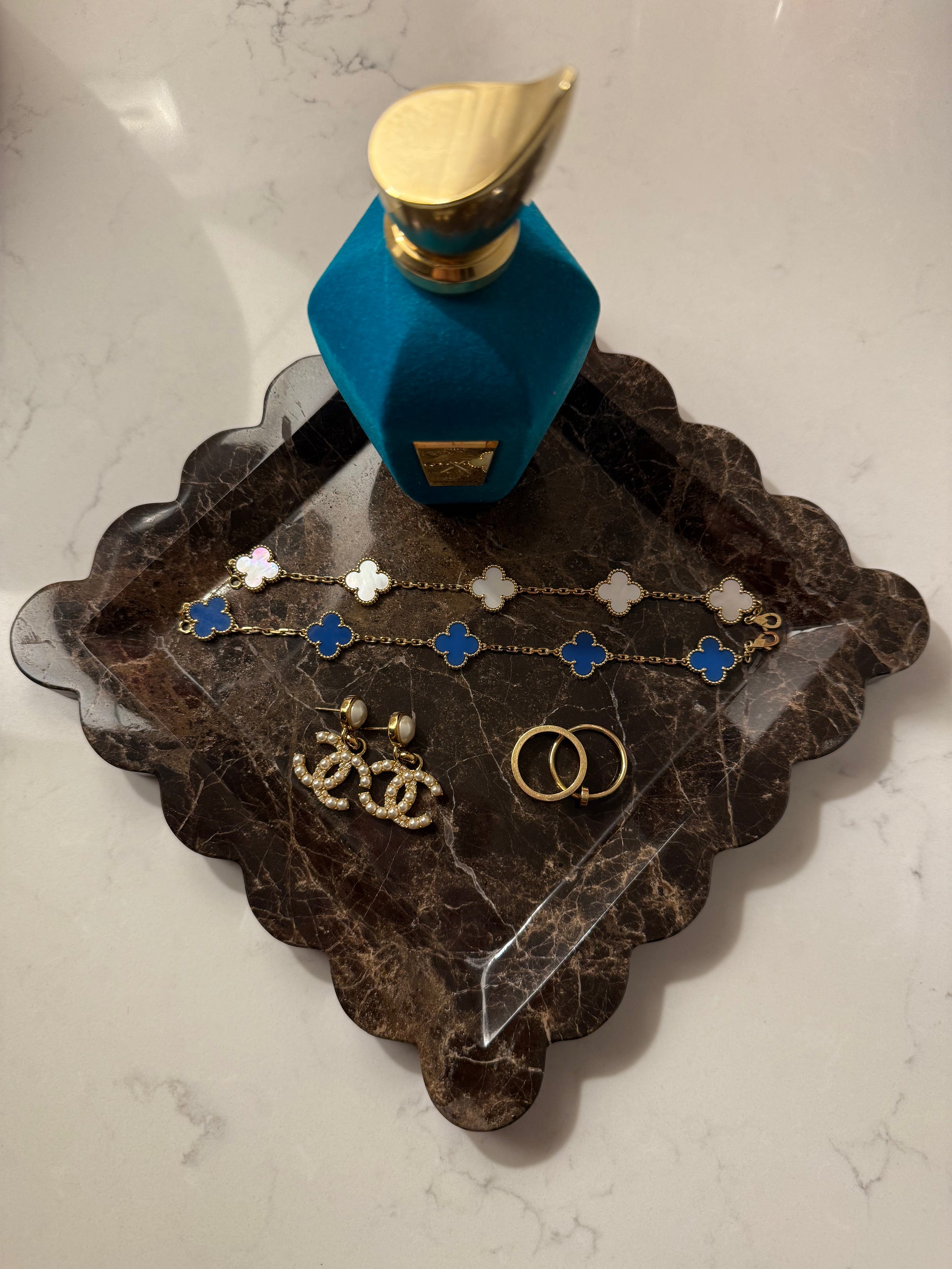 Crafted from richly veined marble, the Mocha Scalloped Tray is a sculptural accent designed to elevate everyday rituals. Its softly scalloped edges bring a sense of fluidity and romance to the natural weight of stone, while the warm mocha tones add depth and understated elegance to any surface. Perfect for styling coffee tables, vanities, bedside tables or consoles, it serves as both a functional piece and a decorative statement.